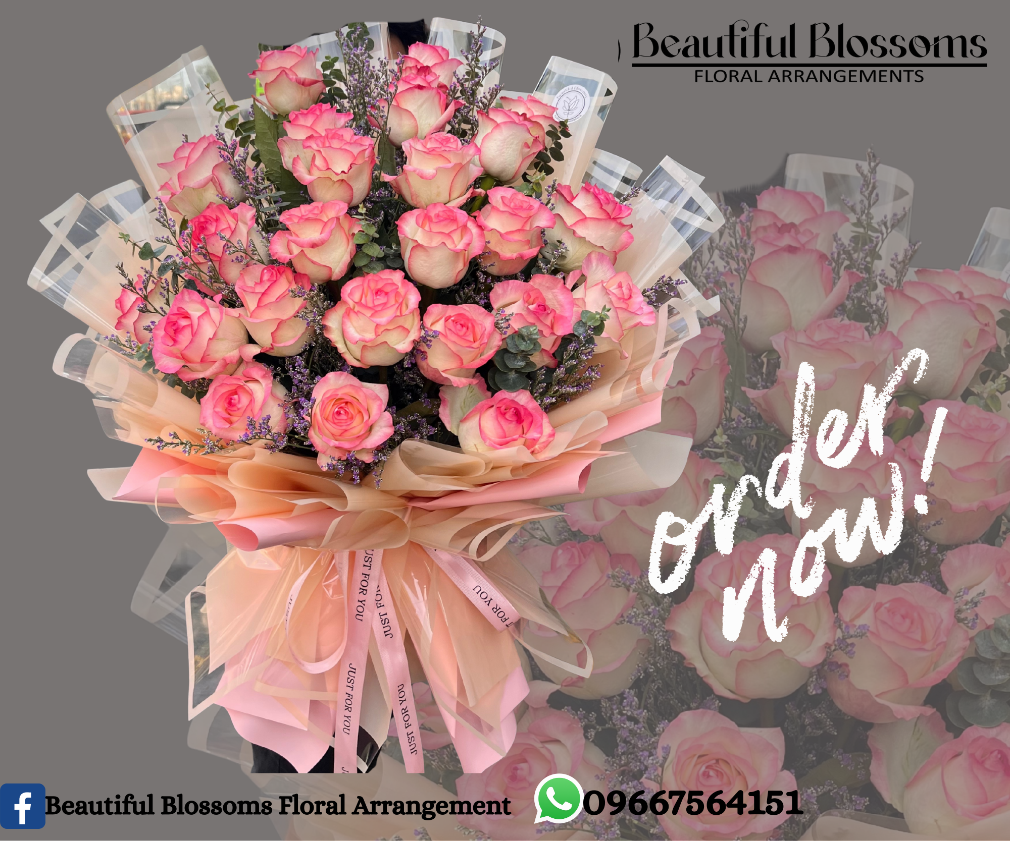 his exquisite hand bouquet features a lush arrangement of blush pink roses delicately edged with soft coral tones, complemented by elegant white baby’s breath (gypsophila) and subtle purple statice fillers. Wrapped in premium cream and translucent Korean-style wrapping and finished with soft ribbon accents, this bouquet radiates romance, grace, and timeless beauty. Perfect for anniversaries, birthdays, proposals, or heartfelt celebrations of love and admiration.