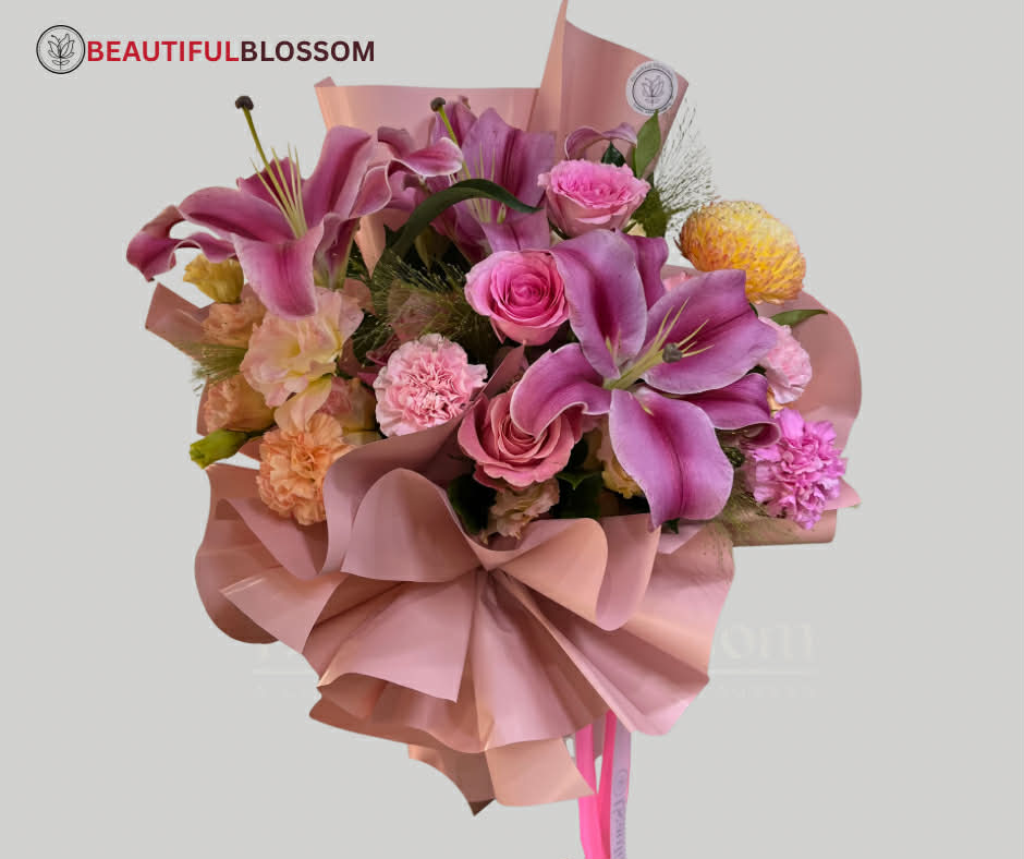 - Delight in the graceful charm of this elegant bouquet, featuring a harmonious blend of warm orange and soft pink roses, delicately paired with lush white baby’s breath (Gypsophila) and subtle accent foliage. Wrapped in gentle earth-toned paper and tied with a soft pink satin ribbon, this bouquet radiates warmth, admiration, and heartfelt affection. Perfect for expressing love, gratitude, or simply brightening someone’s day with a touch of refined beauty.