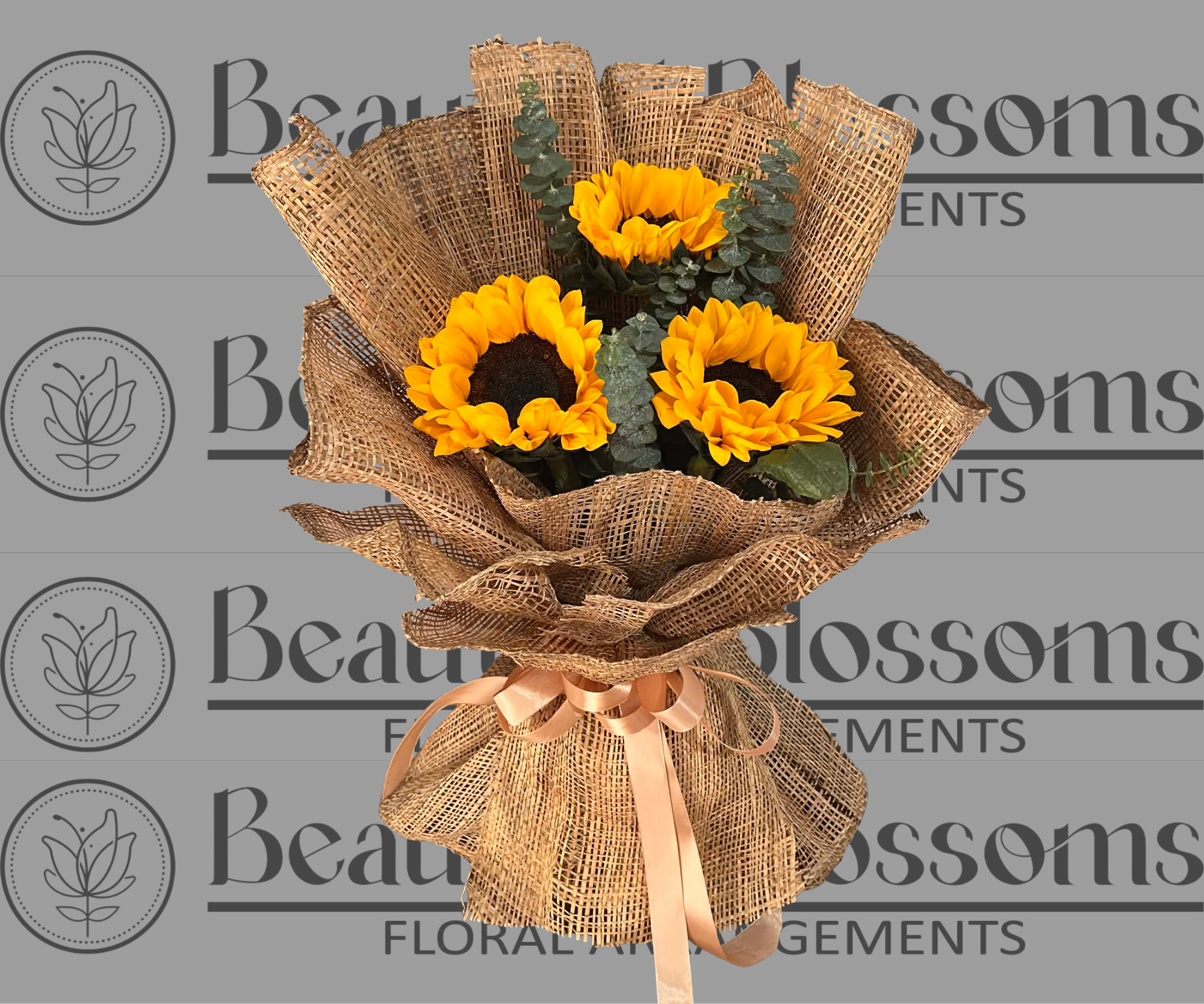 A bright and cheerful bouquet featuring vibrant sunflowers, symbolizing happiness, positivity, and strength. Accented with fresh eucalyptus foliage and wrapped in natural burlap for a rustic, earthy charm, this arrangement radiates warmth and optimism. Finished with a soft satin ribbon, it’s a perfect gift to celebrate achievements, send encouragement, or simply bring sunshine to someone’s day.